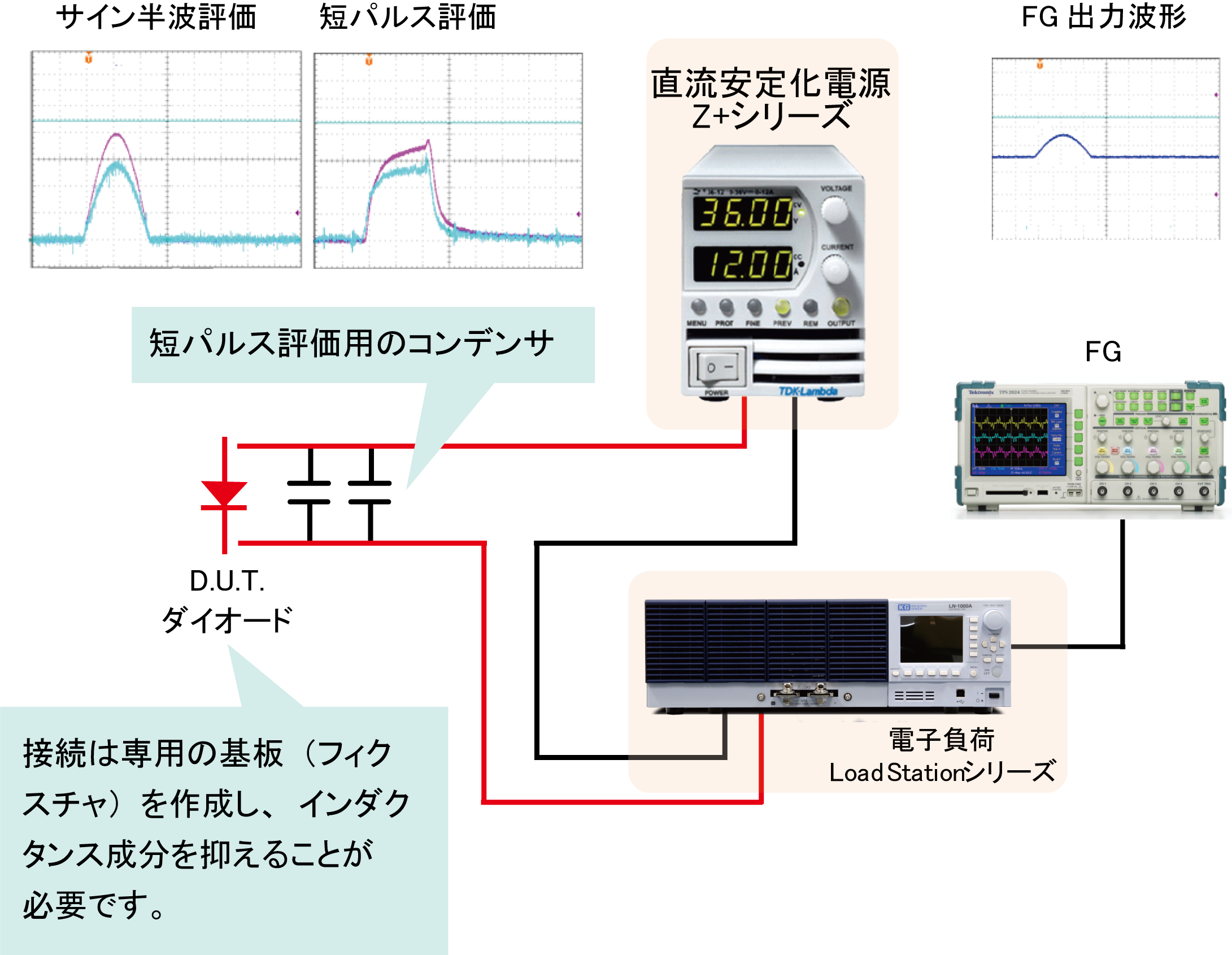 このアプリでは、汎用の直流電源、電子負荷等を使った半導体直流パラメータの簡易的な測定方法についてご紹介します。直流電源と電子負荷により駆動電流を急峻に変化させる試験(短パルス評価)、さらにFG(ファンクションジェネレータ)により電子負荷を制御し、サイン波形での試験(サイン半波評価)を行うことができます。