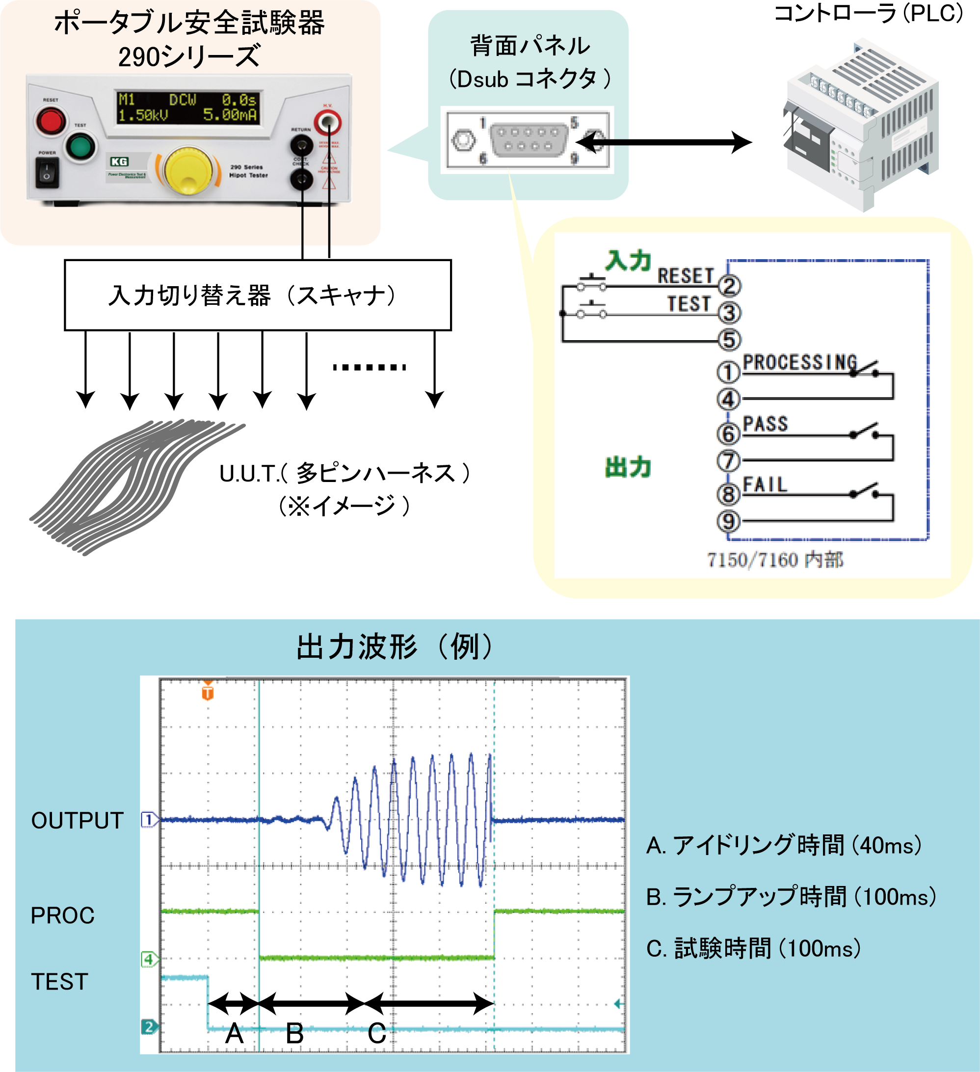 多ピンハーネスやコネクタの耐電圧試験は、そのピン数が多いことから1回の試験時間を最短で行うことが要求されるため、試験時間の高速な耐電圧試験器が必要となります。