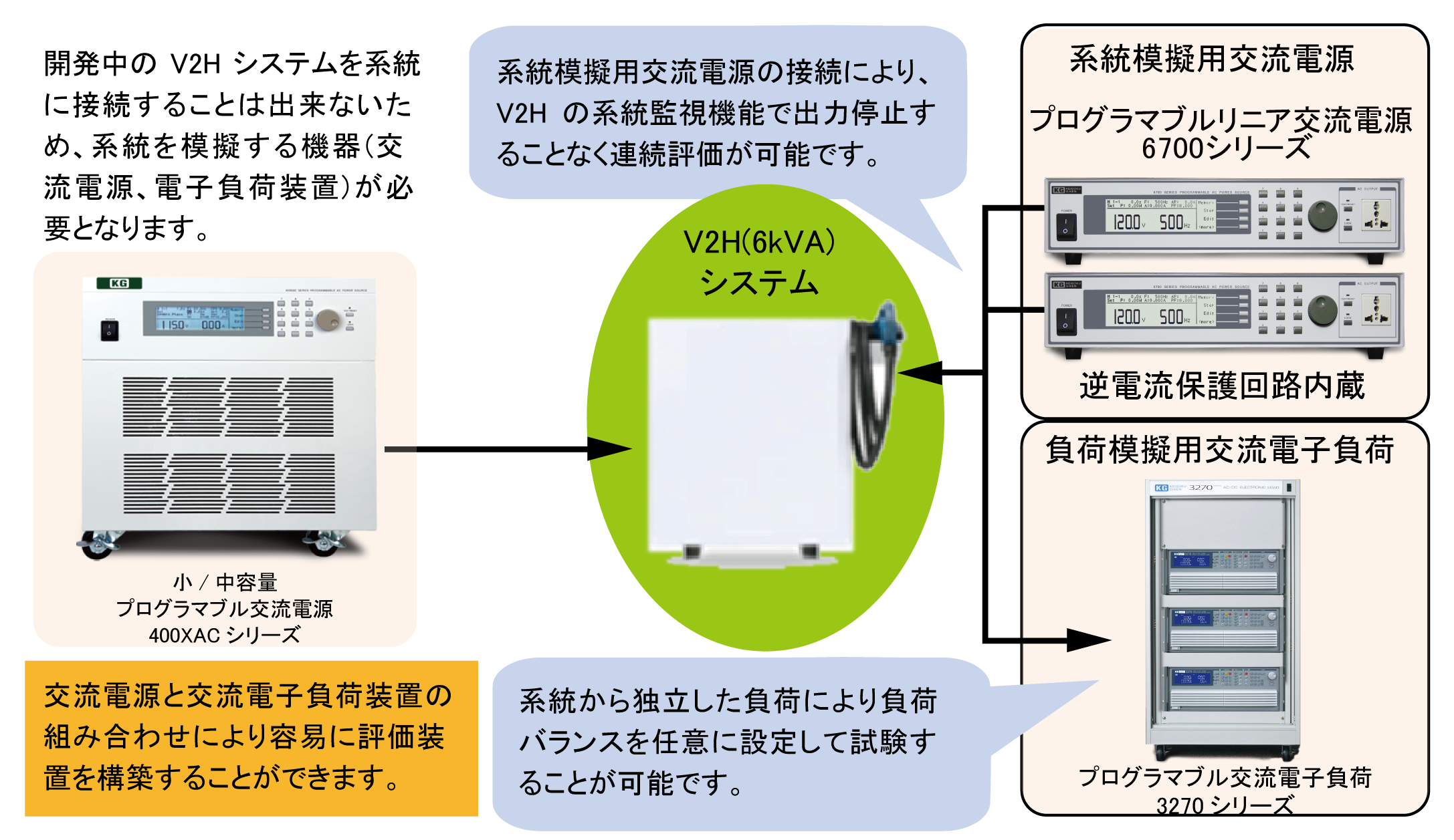このアプリでは、V2H(Vehicle to Home)システムを評価するために必要な機器についてご紹介します。Vehicle(EV)を模擬するための交流電源、系統を模擬するための交流電源、及び系統側の負荷を模擬するための交流電子負荷装置により構成されます。
