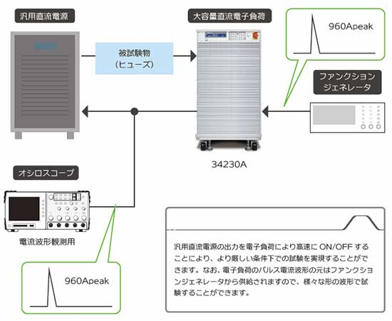 汎用直流電源の出力に電子負荷を挿入し、経路の電流を高速にON/OFFすることによりヒューズの溶断試験に応用することができます。このアプリケーションでは最大960Aまで流せる電子負荷とファンクションジェネレータを組み合わせ、最大960Apeakのパルス電流を実現することができます。