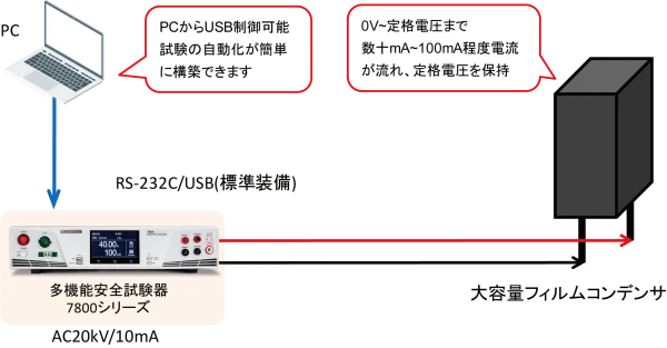 小容量フィルムコンデンサの試験では、高電圧の交流電圧発生装置が必要です。容量が小さい為電流は数mA~10mA程度、定格電圧まで出力可能な電源装置を準備し、寿命試験として1000時間連続印加し破壊の有無を確認します。