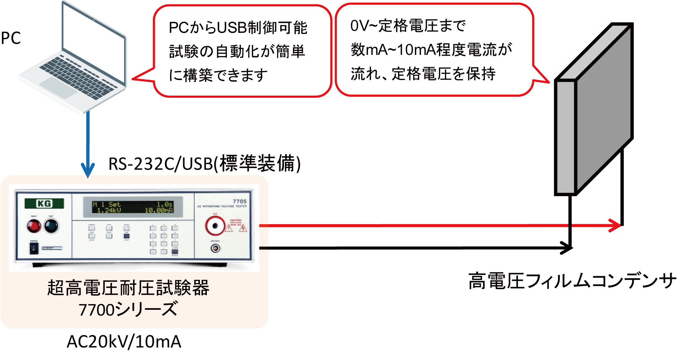- AC電圧、DC電圧ともに20kVの耐電圧試験器を標準品で準備