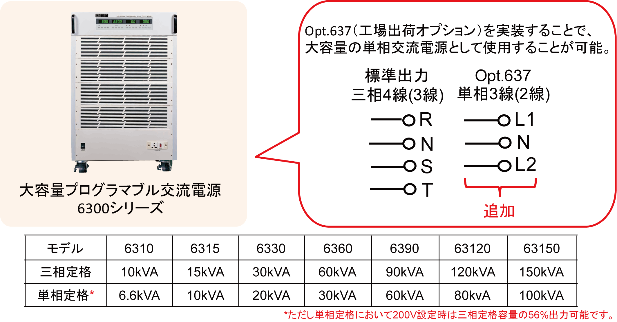 当社三相交流電源は、ローコストの特長生かしつつオプションを追加することで、大容量単相交流電源として使用することが可能です。