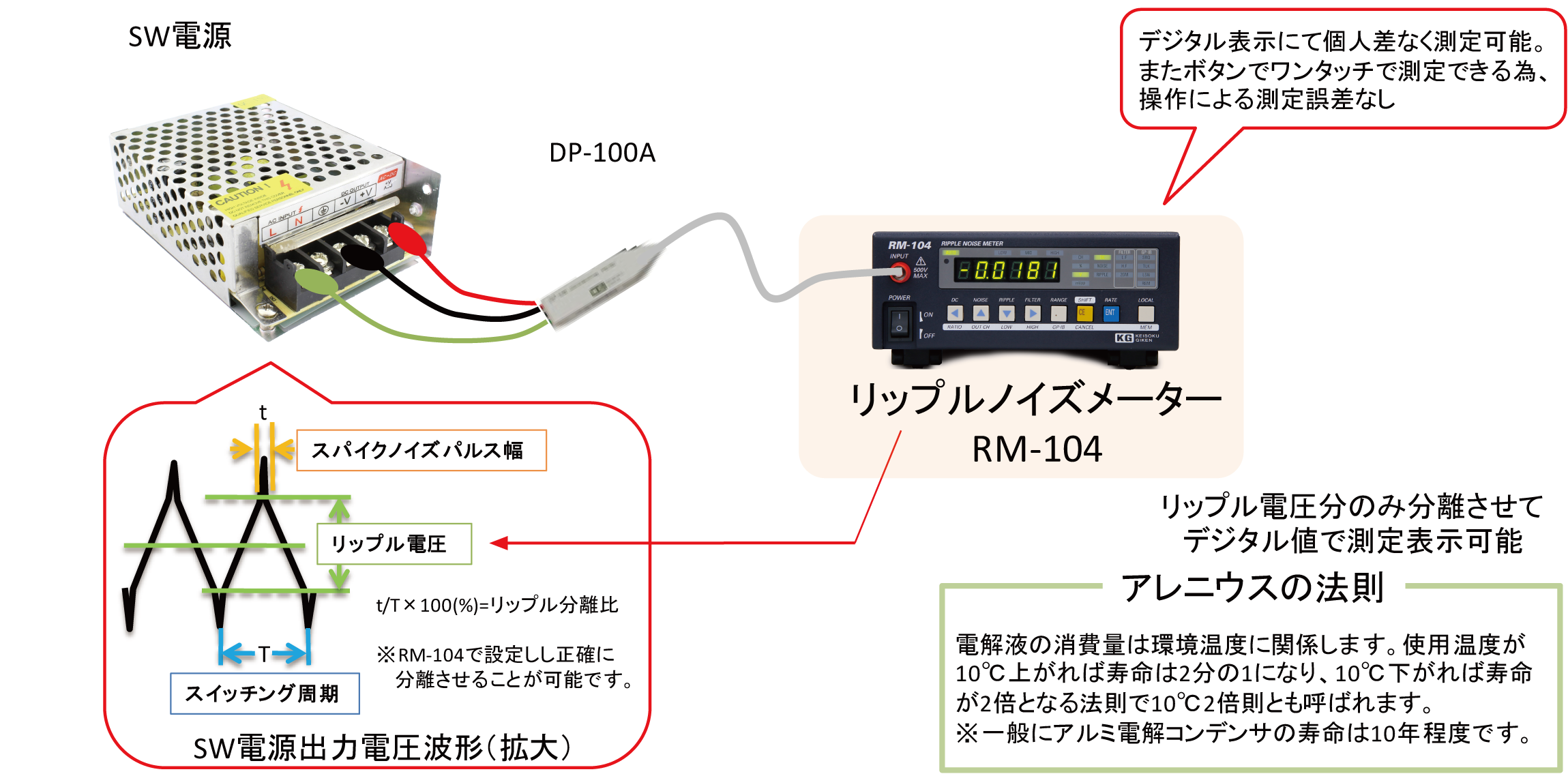 一般的にスイッチング電源の寿命は、電解コンデンサの容量抜けによる故障がほとんどです。電解コンデンサの容量抜けはアレニウスの法則(10℃2倍則)から、使用温度環境から推測はできますが、実環境においてはその判断は温度変化があり困難です。容量抜けの場合SW電源のリップル電圧が大きくなることから、新品と使用中SW電源のリップル電圧を測定することで、故障予知することが可能です。リップルノイズメーターRM-104はオシロスコープを使うことなく、簡単にリップル電圧を分離し測定できる為、複雑な操作や個人差による測定誤差なく、SW電源の寿命判定基準となるリップル電圧を測定することが可能です。