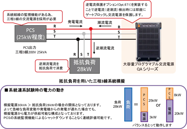 回生型直流電源・電子負荷は、負荷エネルギーを電力系統に逆潮流させるPCS(パワコン)と同じ電力変換を行っております。PCSは単独運転検出機能が内蔵され停電時、電力変換を停止させる保護機能が備わっておりますが、この検出機能が無い回生型直流電源・電子負荷を使用した場合、停電時でも運転継続してしまい受電設備の機器損傷の発生や感電事故につながる可能性があります。機器損傷や感電事故につながらないよう、回生型の直流電源・電子負荷を選定する際には、単独運転検出機能の有無の確認が必要です。