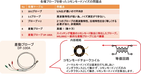 • 差動プローブDP-100Aと接続可能。コモンモードノイズを除去し高周波終端測定が可能