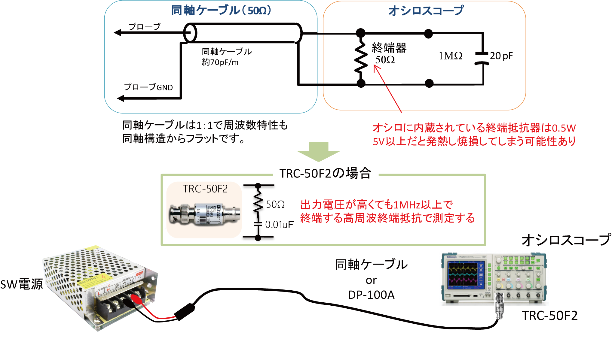 当社TRC-50F2は抵抗器と直列にコンデンサを挿入しており、直流分をカットし測定信号のみを伝送するようになっております。周波数帯域は1MHz~100MHzで50Ω終端され、SW電源などのリップルノイズをオシロスコープで測定する際、破損することなく観測可能です。