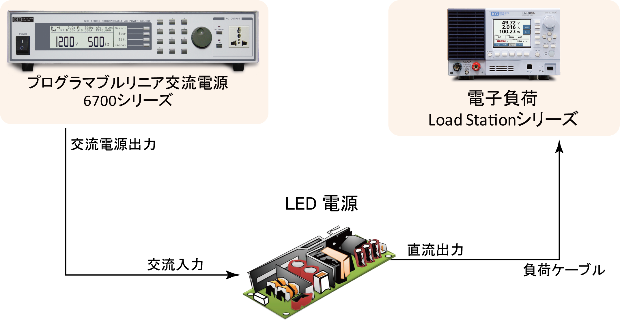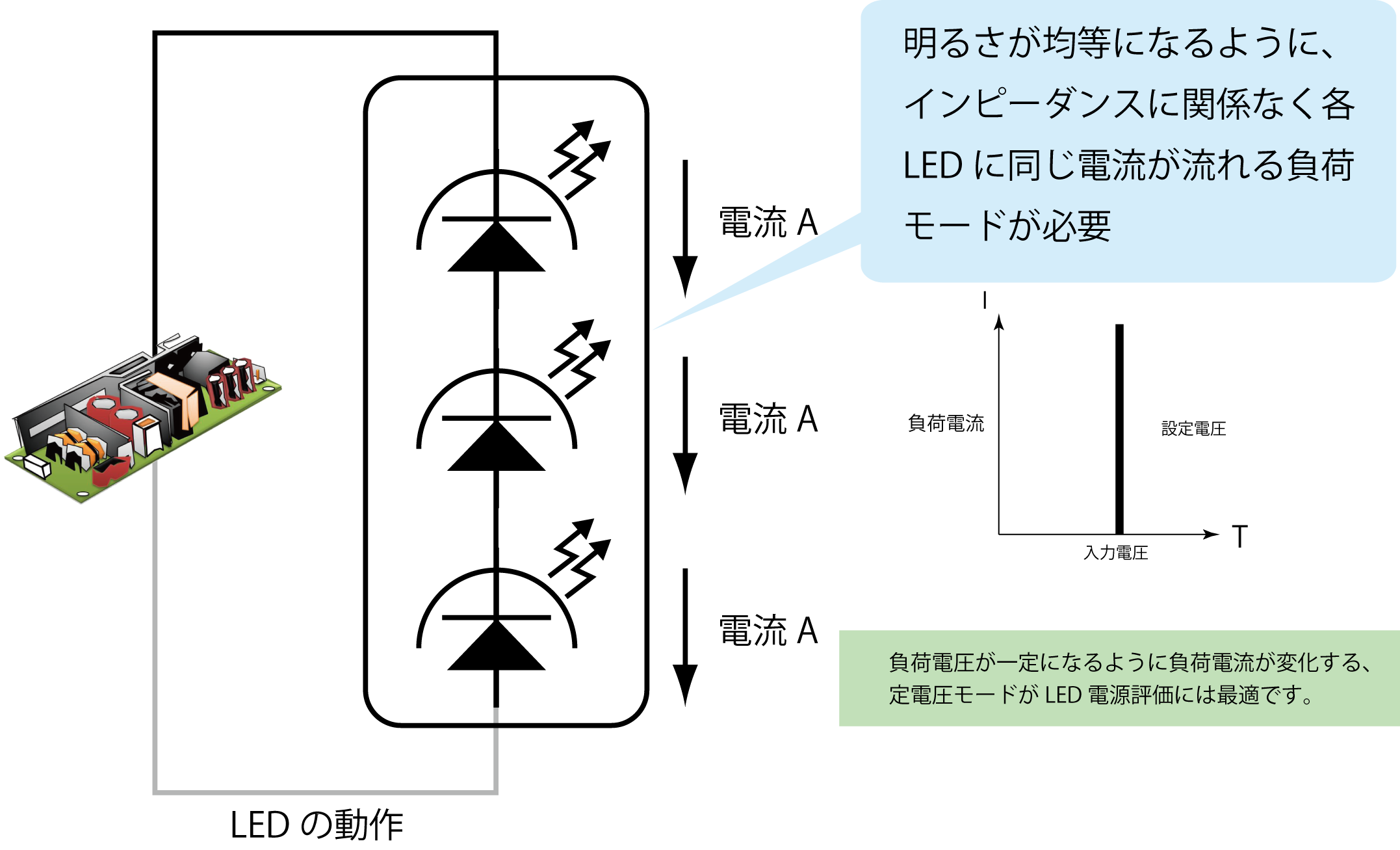 LED電源は一般的なスイッチング電源である定電圧電源とは異なります。LEDを直列に接続し、 各LEDに同じ電流が流れる動作をさせる為、定電流電源となっています。そのため従来評価 で使用していた抵抗負荷では検査ができません。LEDの電圧降下が模擬できる定電圧動作可能な電子負荷装置が必要になります。