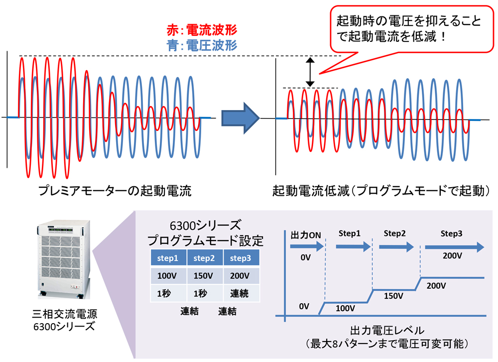 プレミアモーターは一般的なモーターよりも起動電流が連続的に続くため、モーターの定格容量よりも大きい電流供給可能な電源選定が必要となります。6300シリーズはプログラム機能を使い、プレミアモーターの駆動時に発生する起動電流の発生を抑えて駆動させることができます。プレミアモーターに関する規格JIS C 4034において起動電流における検査規定はなく、本方法で行うことで定格容量にあった電源選定が可能です。
