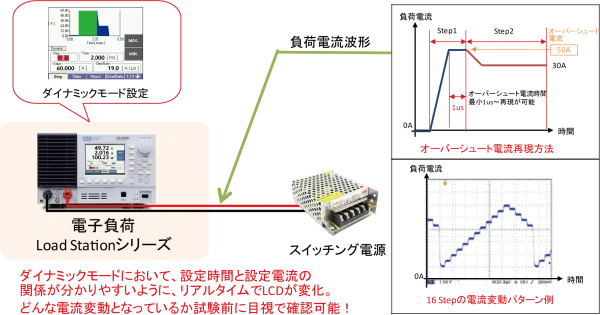 スイッチング電源の過電流保護試験では、電圧と電流をそれぞれ測定し、垂下特性をグラフ化して特性評価します。電流が過電流領域になると保護動作が働き、電圧が垂下していきますが、使用する電子負荷最小動作電圧や内部インピーダンス(抵抗成分)によって、0V付近までの垂下特性の取得ができないことがあります。そこで供試物であるスイッチング電源と直列に可変電源を挿入することで、電子負荷内部のインピーダンス(抵抗成分)をキャンセルさせ、0V付近までの垂下特性グラフの取得が可能となります。