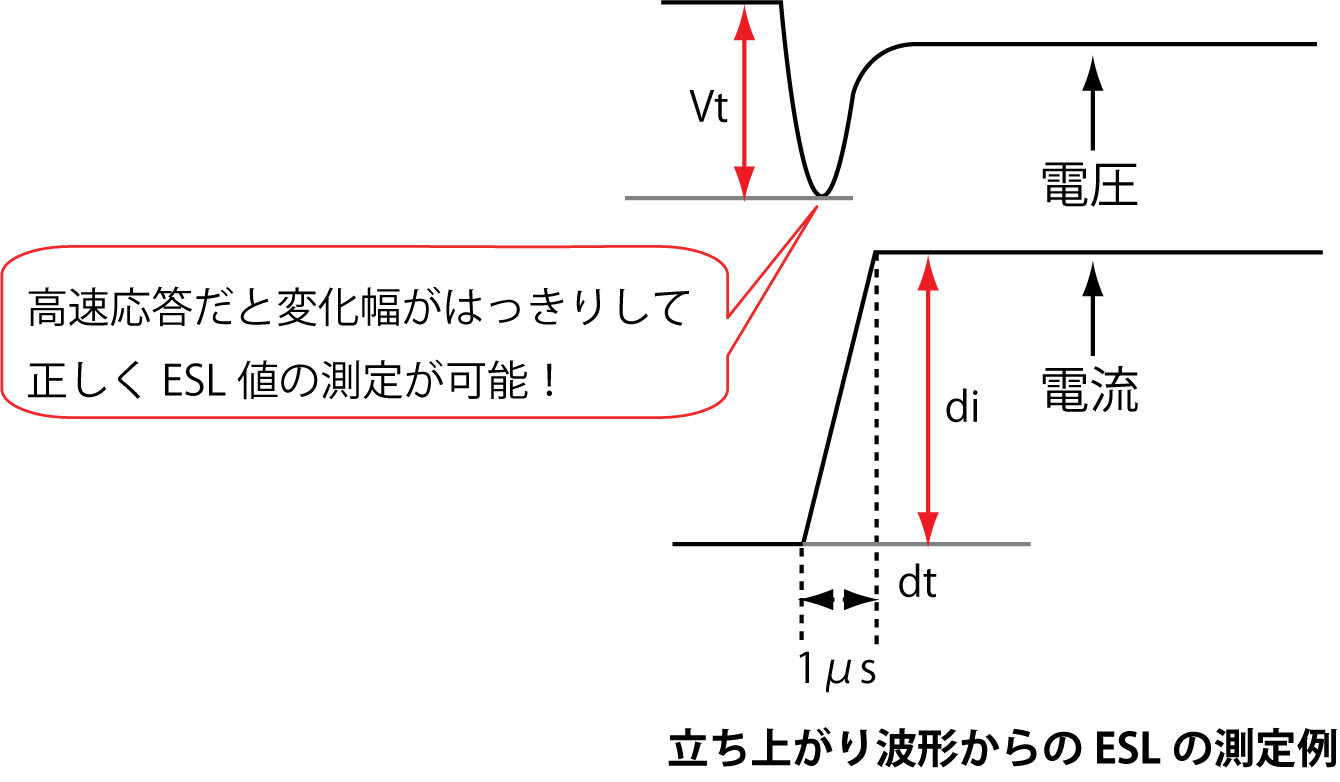 キャパシタの評価ではLCRメータを活用したESR(等価直列抵抗)やESL(等価直列インダクタンス)測定が一般的でした。近年ではFPGAやCPUの高速化により周辺に使われるキャパシタの低ESR化や低ESL化が進み計測が困難になってきておりますが、超高速電子負荷を用いることで、ESLやESRを分離して測定することが可能となりました。