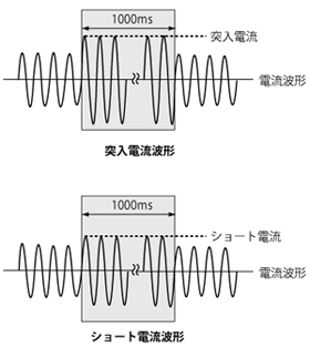 突入(ラッシュ)電流は1000ms 以内の波形を想定しており、ピーク電流(連続)とは定義が異なります。