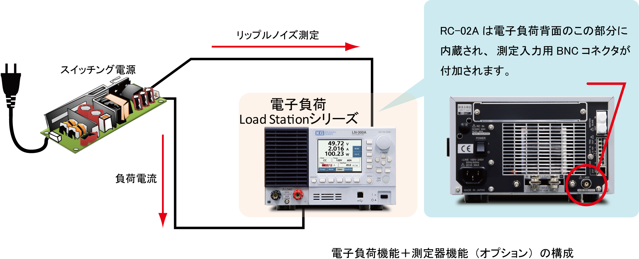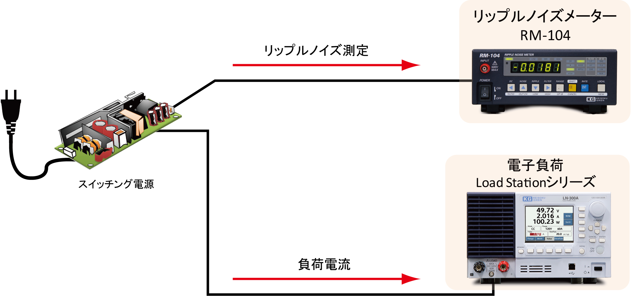 スイッチング電源の出力に現れるリップルノイズ電圧の測定はリップルノイズメータにより容易に測定することができますが、リップルノイズ測定時にはスイッチング電源の出力に流す電流値を無負荷、定格負荷など、いくつかの条件で試験することが必要です。そこで弊社では電流を流すための装置(電子負荷)の中にリップルノイズメータを内蔵し、負荷設定とリップルノイズ測定を1台の機器で容易に行えるようにしました。