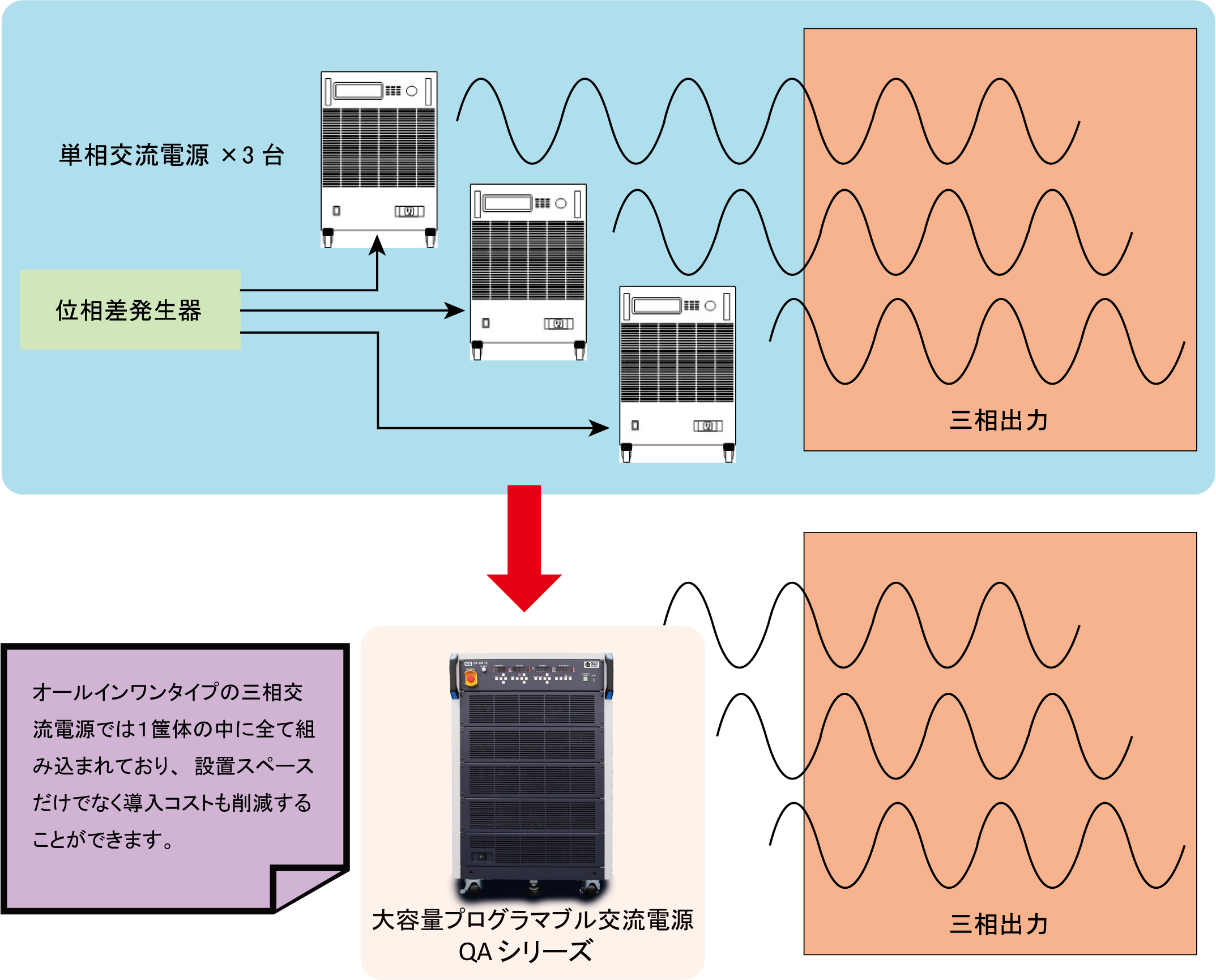 多くの三相交流電源は、3台の単相交流電源を位相差発生器により外部制御して実現しています。この方式では単相交流電源としても使用できるというメリットが有る反面、単純に3倍の設置スペースが必要になるというデメリットがあります。ここでは省スペースな三相交流電源についてご紹介します。