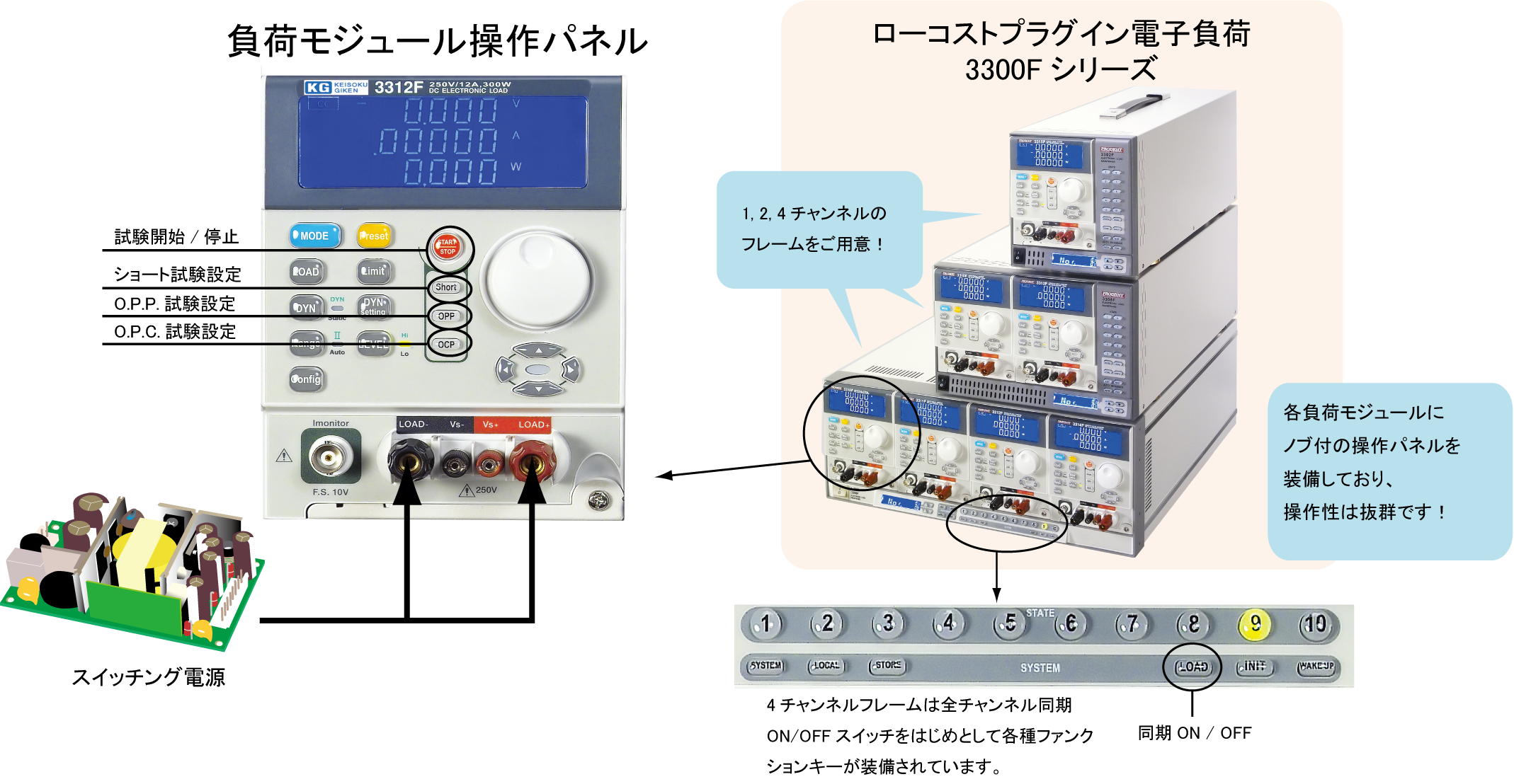下の表のようにスイッチング電源試験ではポピュラーなO.C.P.などの試験機能をビルトインテスト機能として内蔵しており、4チャンネルフレームでは負荷電流を全チャンネル同期でON/OFFすることが可能ですので、チャンネル同期が必要な評価試験にも適しています。