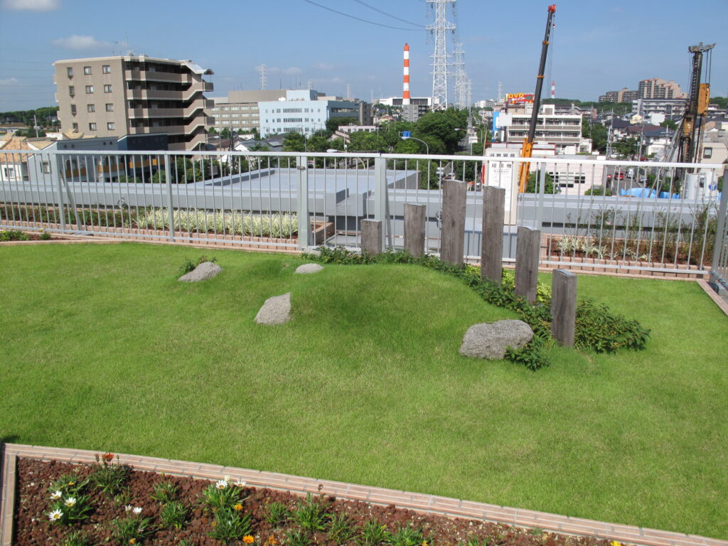 CO2削減を目的に、当社の本社(現商品センター)を屋上緑化して屋上庭園を完成させ、緑化面積増を実施