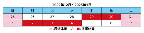 【休業期間】2022年12月29日(木)~2023年1月4日(水)