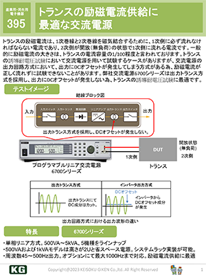 トランスの励磁電流は、1次巻線と2次巻線を磁気結合するために、1次側に必ず流れなければならない電流であり、2次側が開放(無負荷)の状態で1次側に流れる電流です。一般的に励磁電流の大きさは、トランスの電流容量の1/100程度と言われております。トランスの誘導耐電圧試験において交流電源を用いて試験するケースがありますが、交流電源の出力回路方式において、出力にDCオフセットが発生してしまう方式がある為、励磁電流が正しく流れずに試験できないことがあります。弊社交流電源6700シリーズは出力トランス方式を採用し、出力にDCオフセットが発生しない為、トランスの誘導耐電圧試験に最適です。