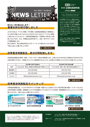 NEWS LETTER No.52-01を発行致しました 2023-10-25 最終更新日時 : 2023-10-25 kg_master 本日、KG NEWS LETTERを発行致しました。 今月は、当社一部移転のご案内、目黒電波測器製品のご紹介をお送り致します。 ぜひご覧ください。 メルマガ配信中! 現在当事業部ではニュースレター、アプリケーション、テクニカルレポートの更新をご案内するメールマガジンを配信しております。ぜひご登録ください! メルマガ配信お申し込み