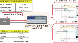 UPSや商用インバータの評価や試験において、突入電流試験を行う際は、実負荷の準備や試験回路などで再現させる為、準備や必要な突入電流値の設定に多くの時間がかかる試験項目でした。シミュレータ機能をもって交流電子負荷を用いることで、各種パラメータの設定により、要求する容量負荷性の突入電流や電源投入時のシミュレーションおよび電化製品へ直接電源を差し込んだサージ電流の再現を簡単に行うことができます。