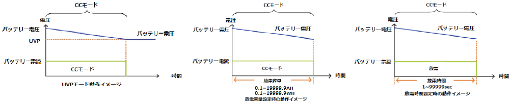 3つのバッテリー放電モードを搭載。指定電圧(UVP)、放電容量、放電時間の停止条件を設定したバッテリー放電が可能です。