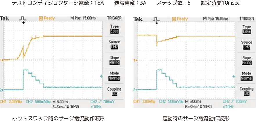 独自のサージ電流テストモードは、電源入力回路の起動時の瞬間的なサージ電流と、ホットスワップ時のサージ電流のシミュレーションが可能です。 サージ電流と定常電流の両方の設定が可能で、サージ電流は設定したステップ数と設定時間に応じて階段状な電流波形となります。