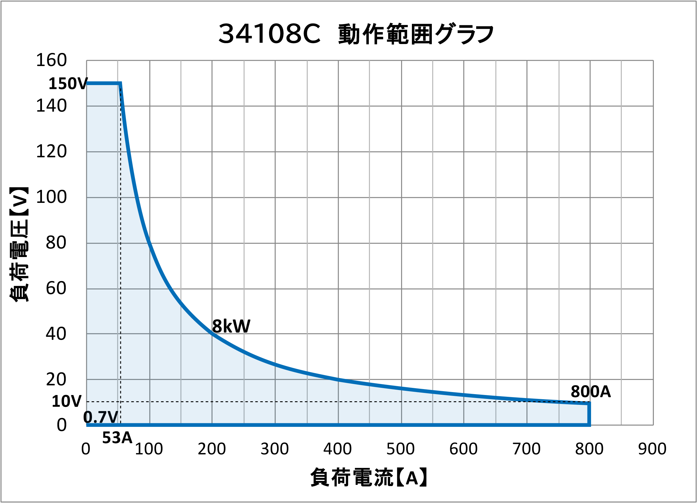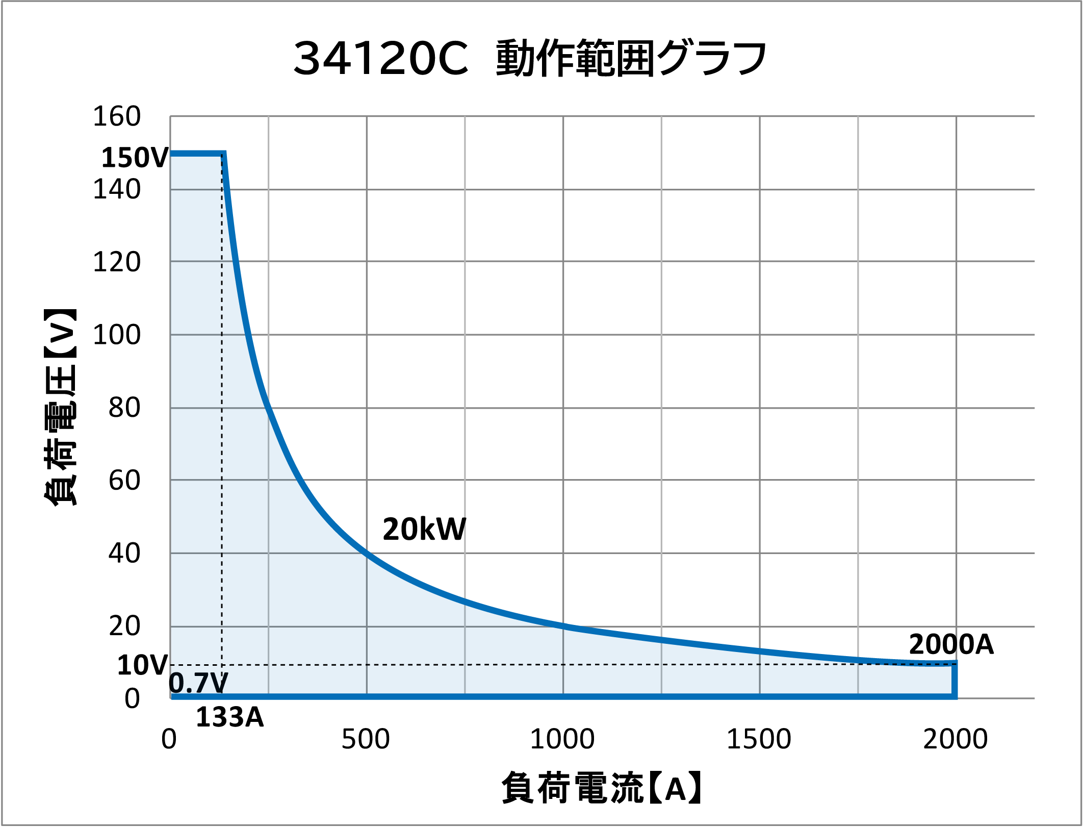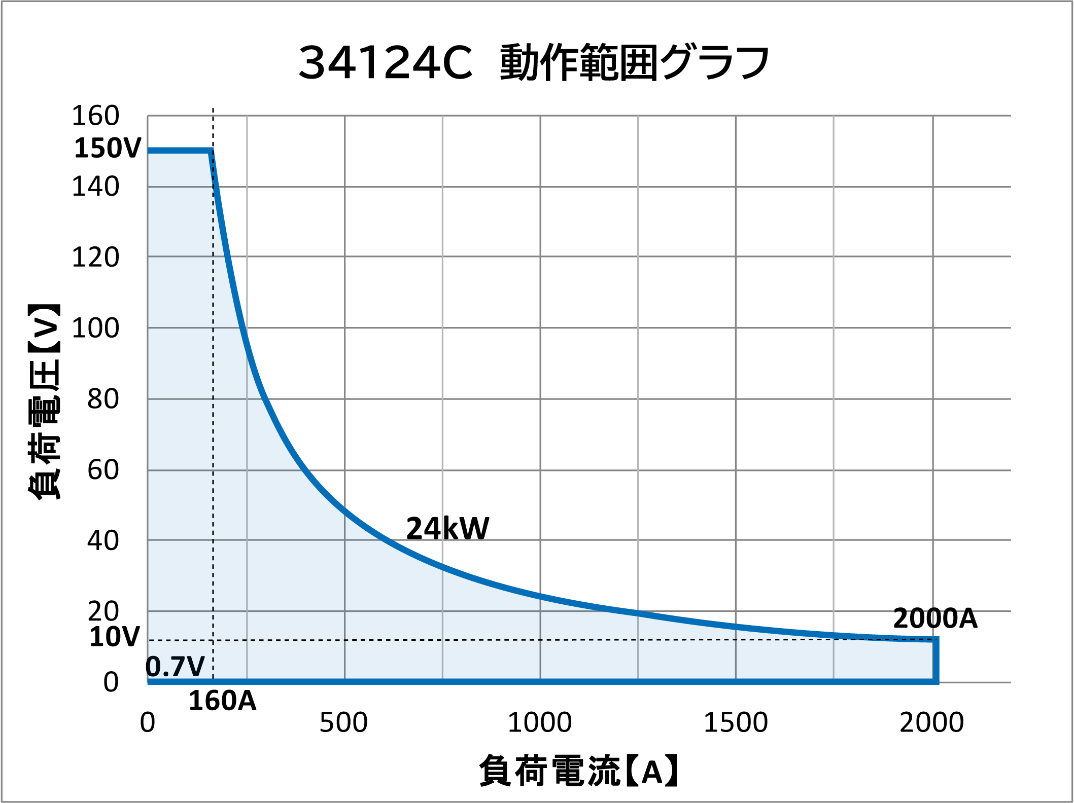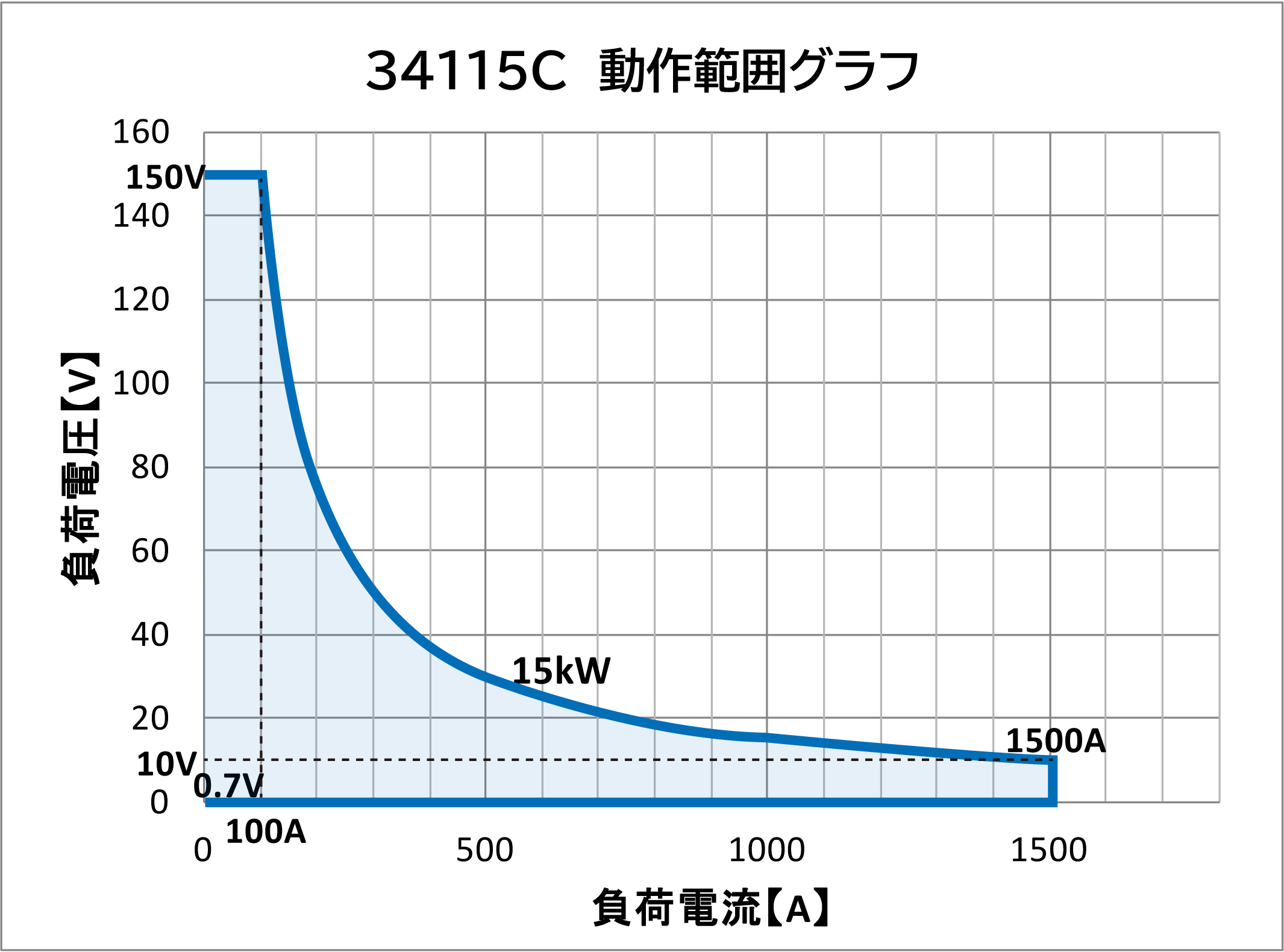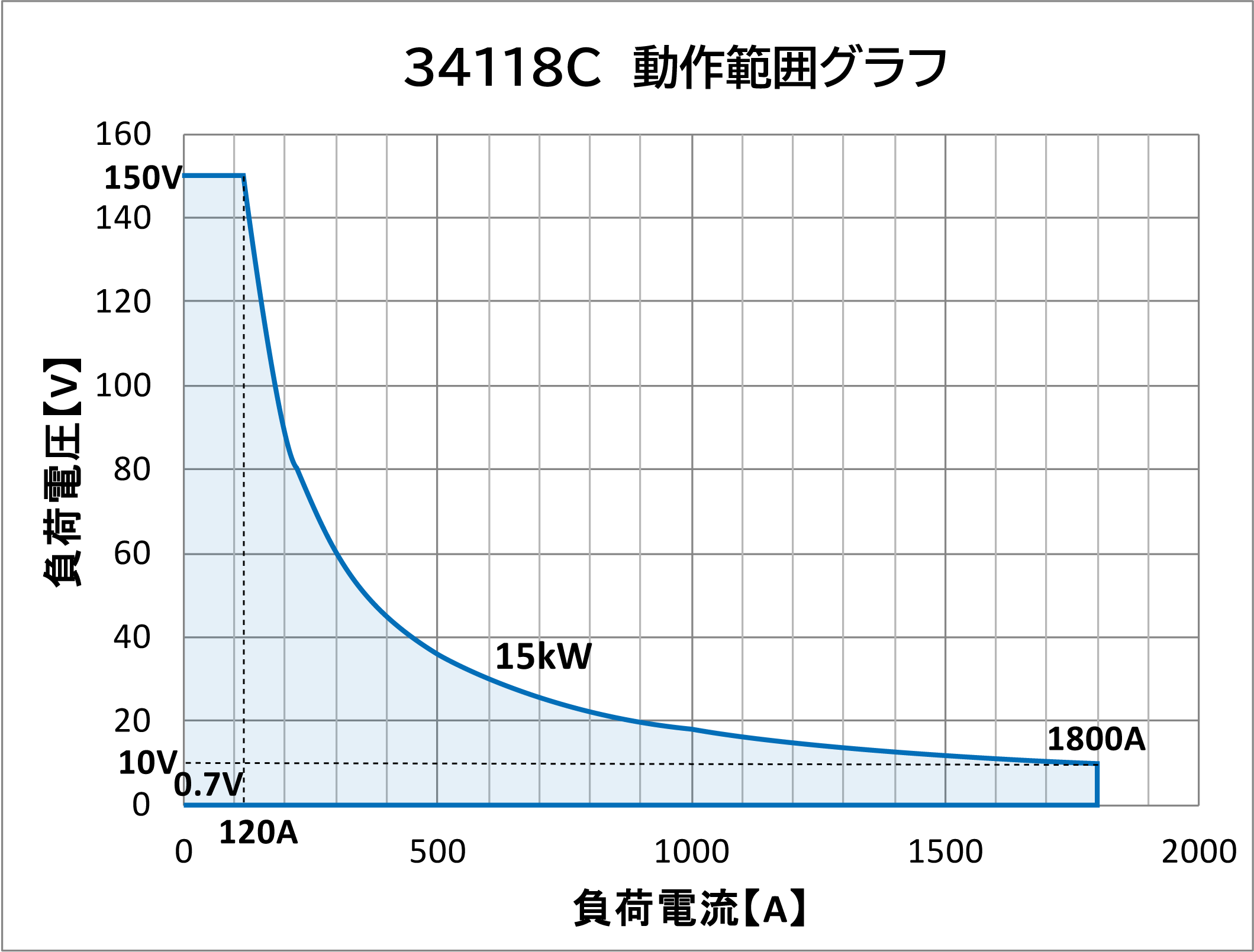 - 当社電子負荷はレンジ幅が広くなっております。印加電圧、負荷電流に対し電力制限が掛かる場合がございますのでご注意ください。