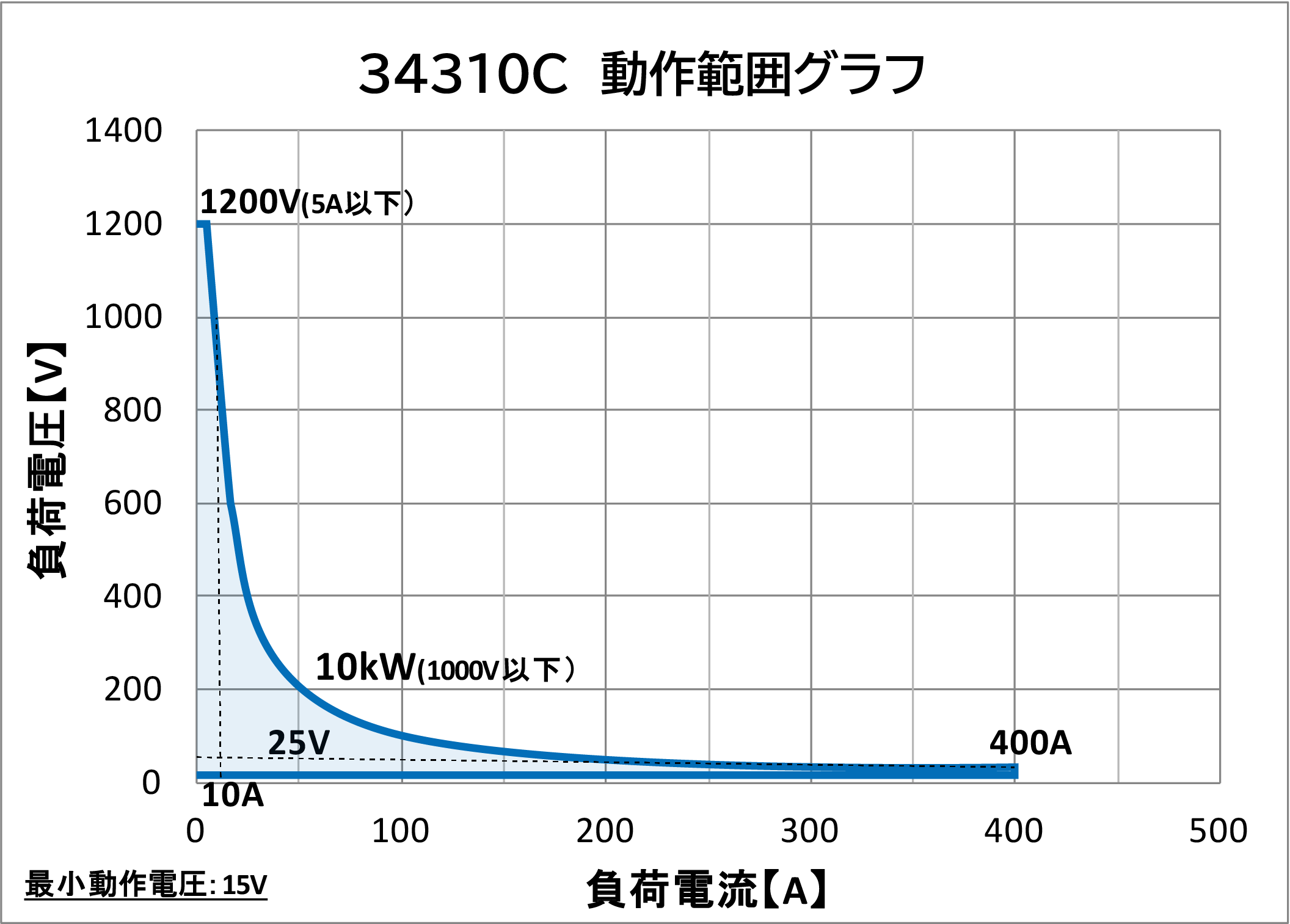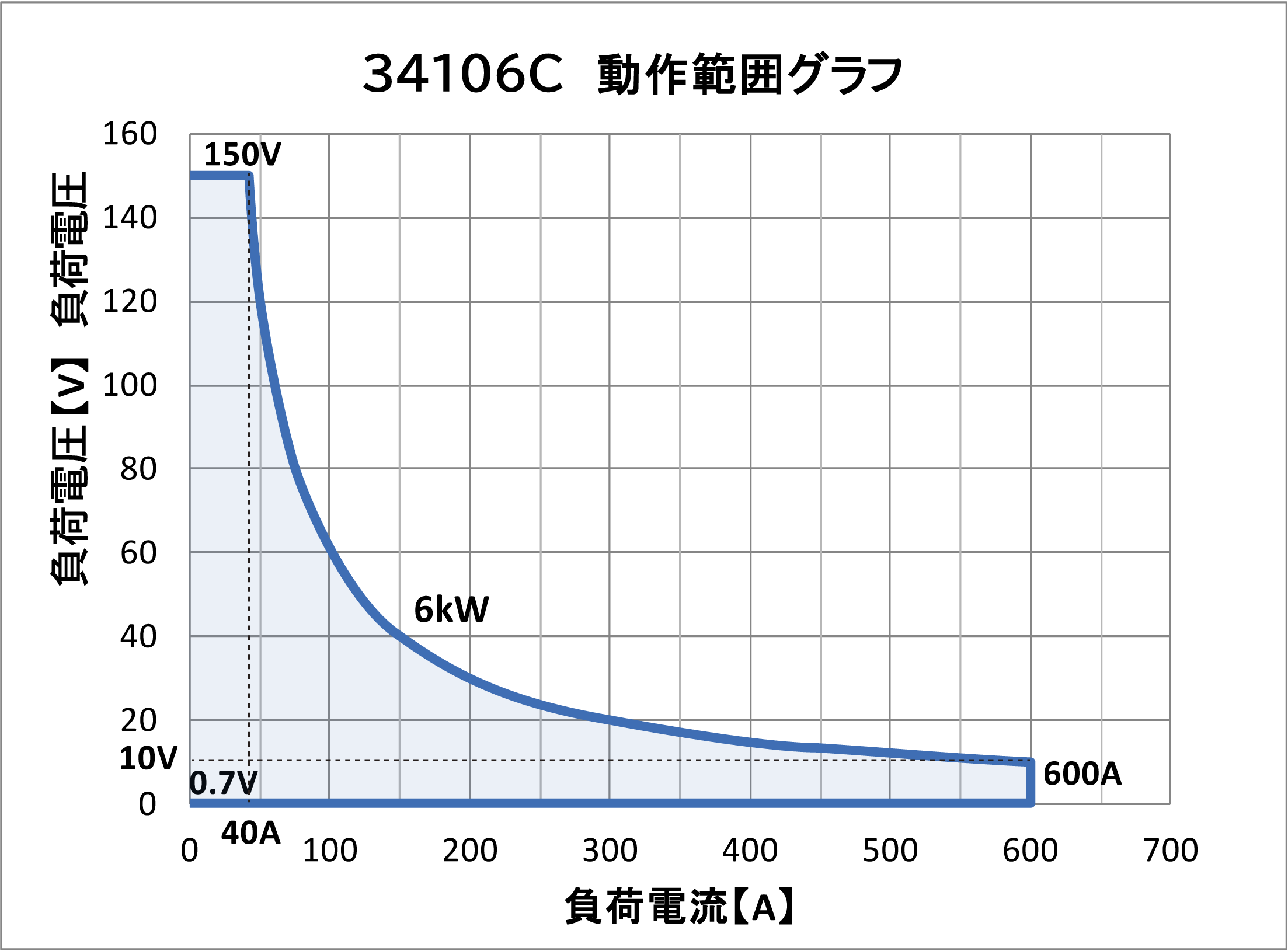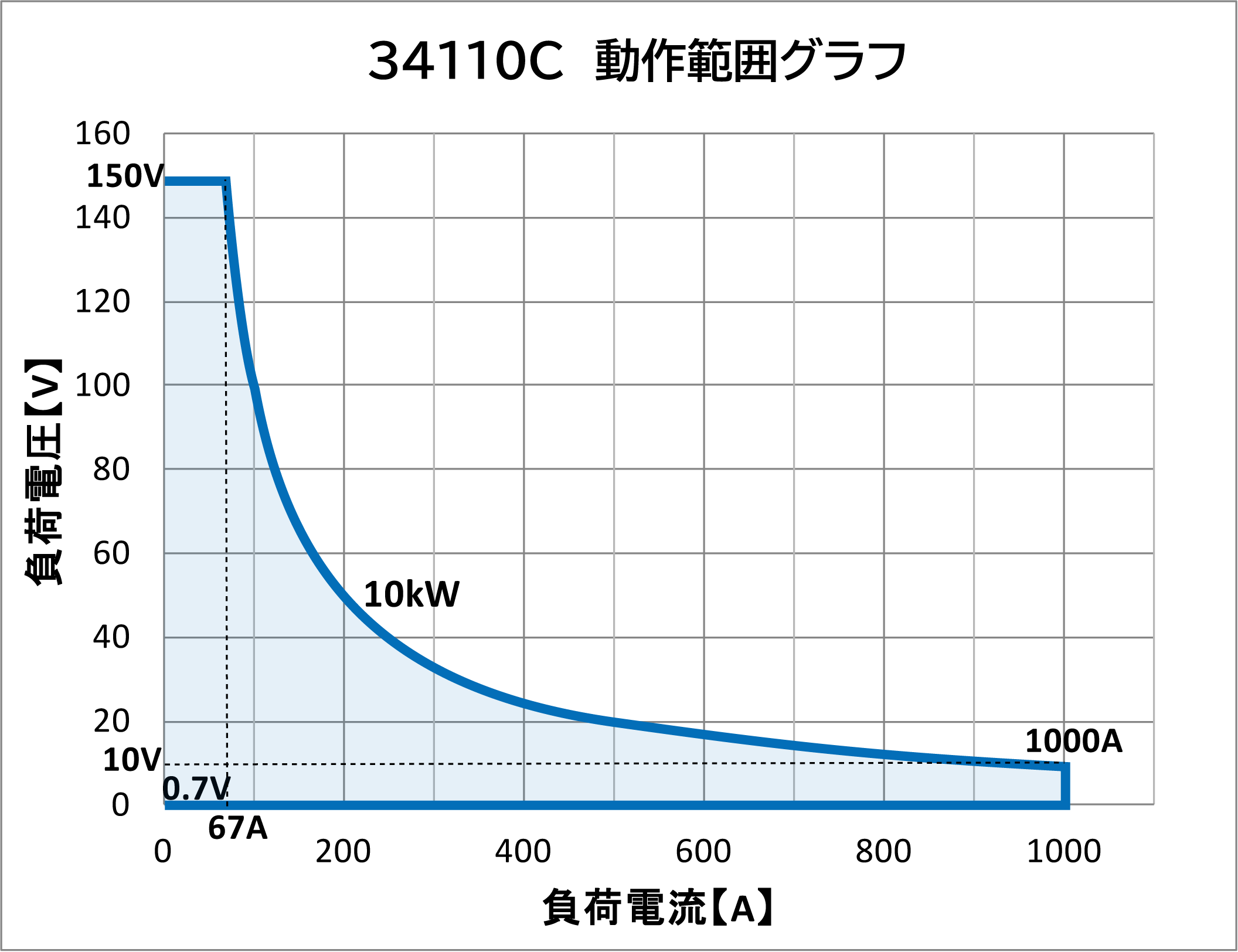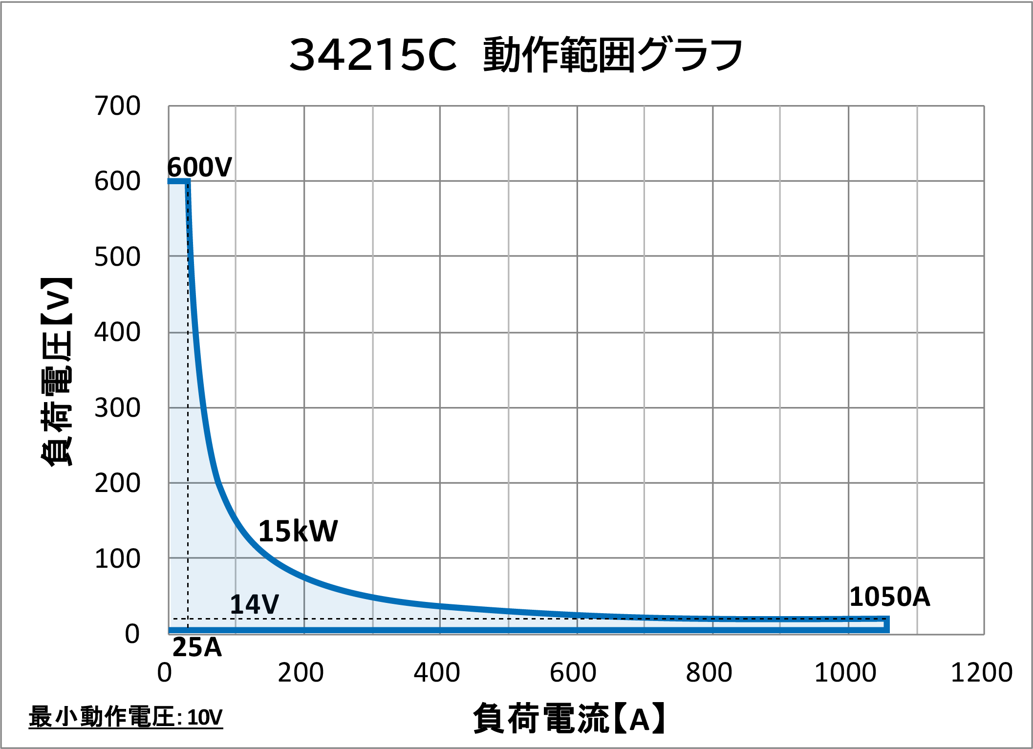 - 当社電子負荷はレンジ幅が広くなっております。印加電圧、負荷電流に対し電力制限が掛かる場合がございますのでご注意ください。
