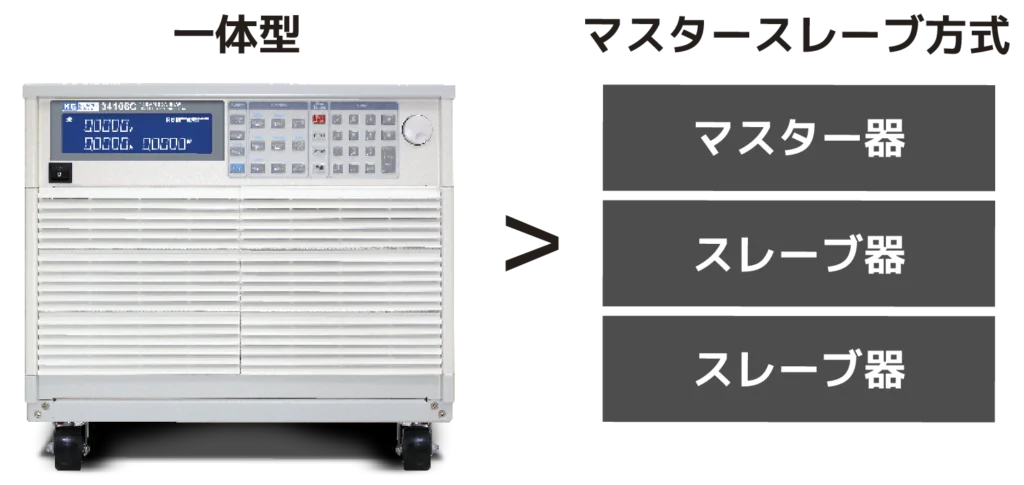 組み合わせから、最大電流:1600A、最大容量192kWまで負荷構成が可能となります。また、同一電圧の定格モデルであれば、異なる定格容量モデルでもマスタースレーブ接続可能です。(34124Cは除く)開発時における投資において、導入した設備を生かし容量アップすることが可能です。