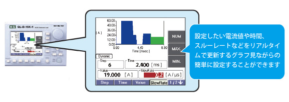 ダイナミックモードにおいて、設定時間と設定電流の関係が分かりやすいように、リアルタイムで液晶パネル内のChart(グラフ)が変化。どんな電流変動となっているか試験前に目視で確認が可能です。