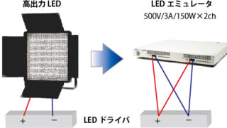 近年のパワーLEDの普及にともない、水銀灯やHIDランプのような高出力照明もLED化が進んでおります。当社の2チャンネルLEDエミュレータLE-5150-02は、150Wの2チャンネルを並列接続することにより300Wとして使用することができますので、水銀灯やHIDランプの代替えLEDを点灯するドライバの試験にも使用することができます。