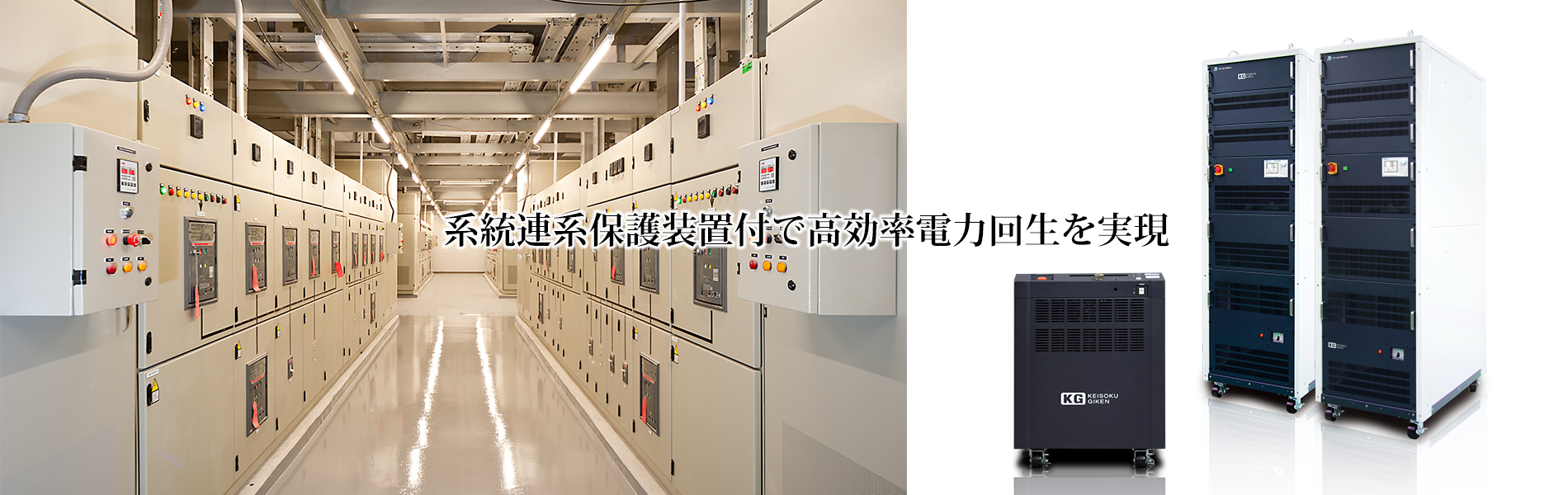 一般的な電子負荷はドロッパ-方式と呼ばれ、電子負荷に流れ込む電流(電力)は「熱」として空気中に放出されます。このため、大電力用の電子負荷では、大きな発熱となるため冷却用のファンが必要なのはもちろん、場合によっては電子負荷が設置された室内の空調も必要となります。これに対してスイッチング方式の回生型電子負荷は、電子負荷に流れ込む電流(電力)を熱に変えるのではなく、電源系統に戻し電力を再利用することが出来るというもので、発熱が少なく、ドロッパー方式の電子負荷と比較してサイズも小さくすることができます。