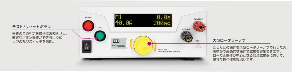 一般的なアース導通試験(30A)では、最大で約150mΩまでしか測定することができません。260シリーズの電力容量は一般的なアース導通試験器の約2倍の出力容量があり、60A出力で150mΩまでの測定が可能です。