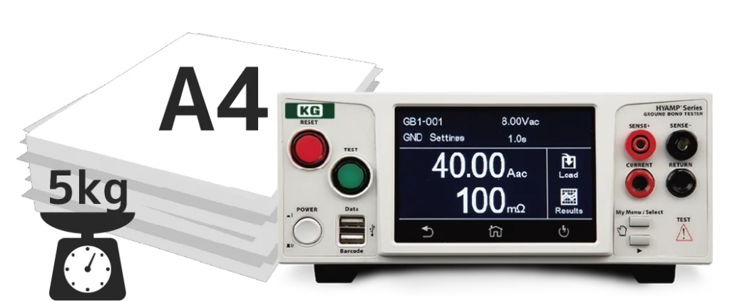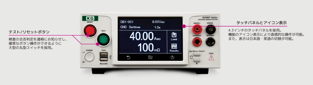 質量5kg、設置面積がA4用紙サイズに収まるというコンパクトサイズながら、試験電流は最大AC/DC 40Aまで設定可能です。見やすい4.3インチカラータッチパネルを搭載し高い操作性をご提供します。