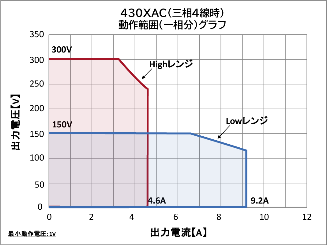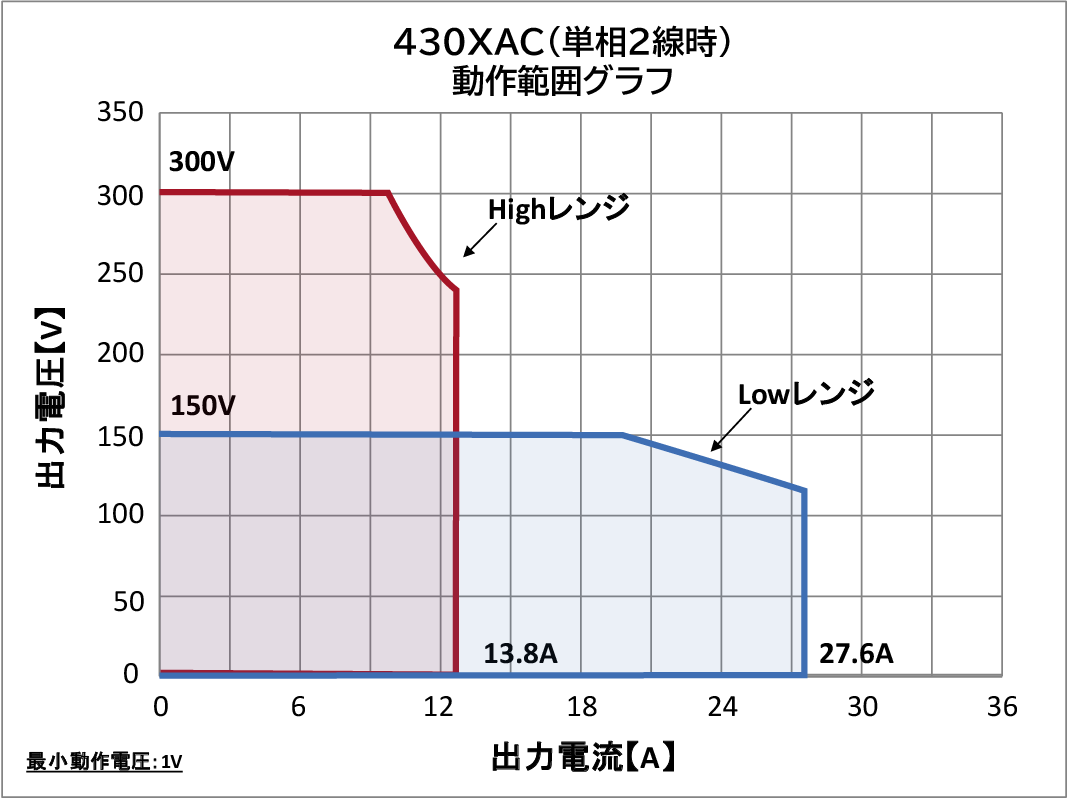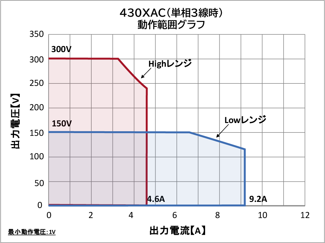 - 製品によって出力電力がワイドレンジとなる機種がございます。この場合、出力可能な電圧、電流に制限が掛かることがございますのでご注意ください。