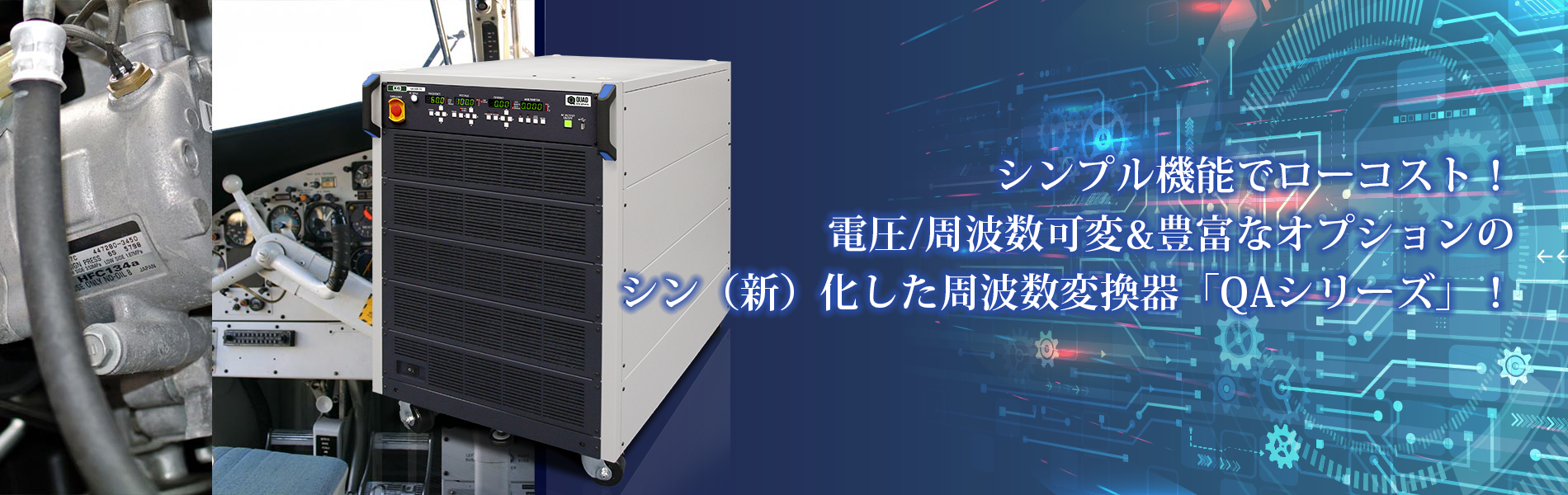 計測技術研究所の周波数変換器は、三相15kVA~三相90kVA出力と大容量に特化したパワーバンドをラインナップしております。航空/船舶部品における品質保証(QA)や製造、定期検査用向けの400Hz入力電圧源から、航空機/船舶用の地上用電源まで用途に合わせて選定可能です。また一体型のPWM方式(スイッチング)を採用し、省スペースかつローコストを実現しております。