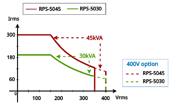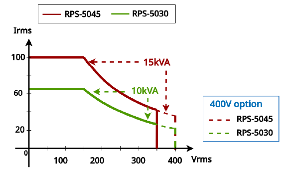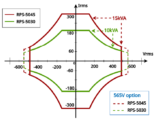 | RPS-5030 | 30kVA | 単相2線/3線 三相3線/4線 | 350Vrms | 200A(単相)/66.7A(三相/単相2線) | 30Hz - 150Hz | ±495V(単相2線) ±990V(単相3線) | 200A(単相)/66.7A(三相/単相2線) |