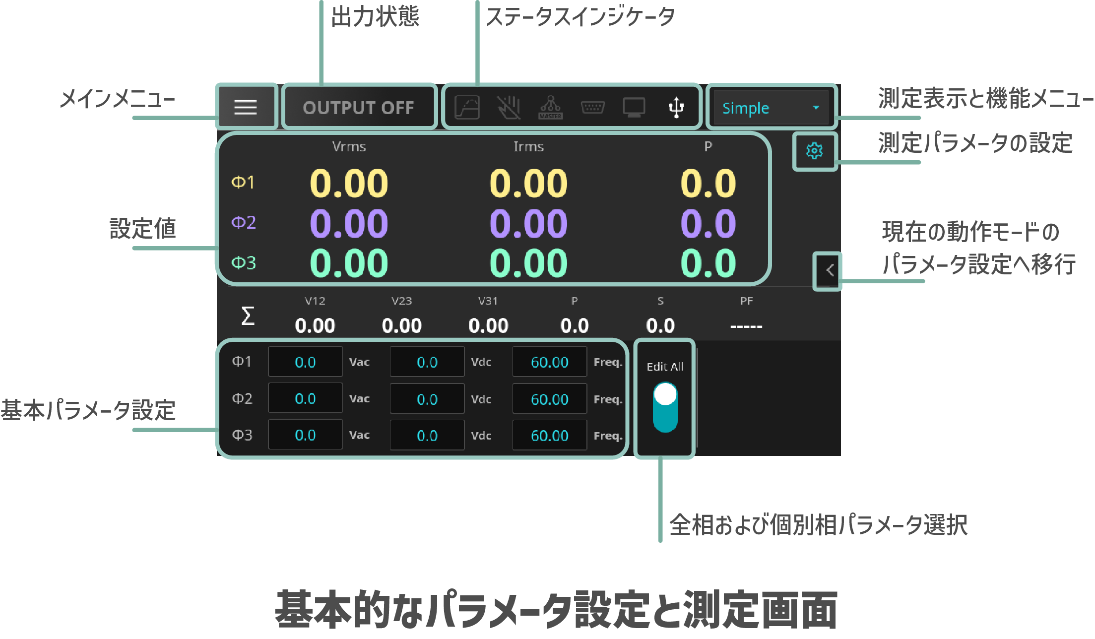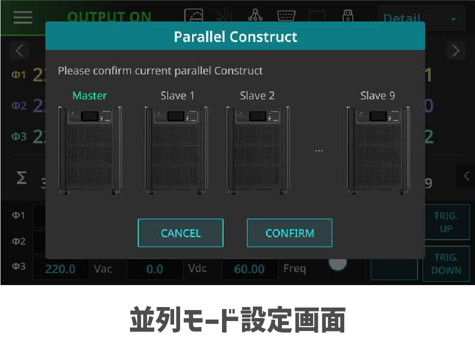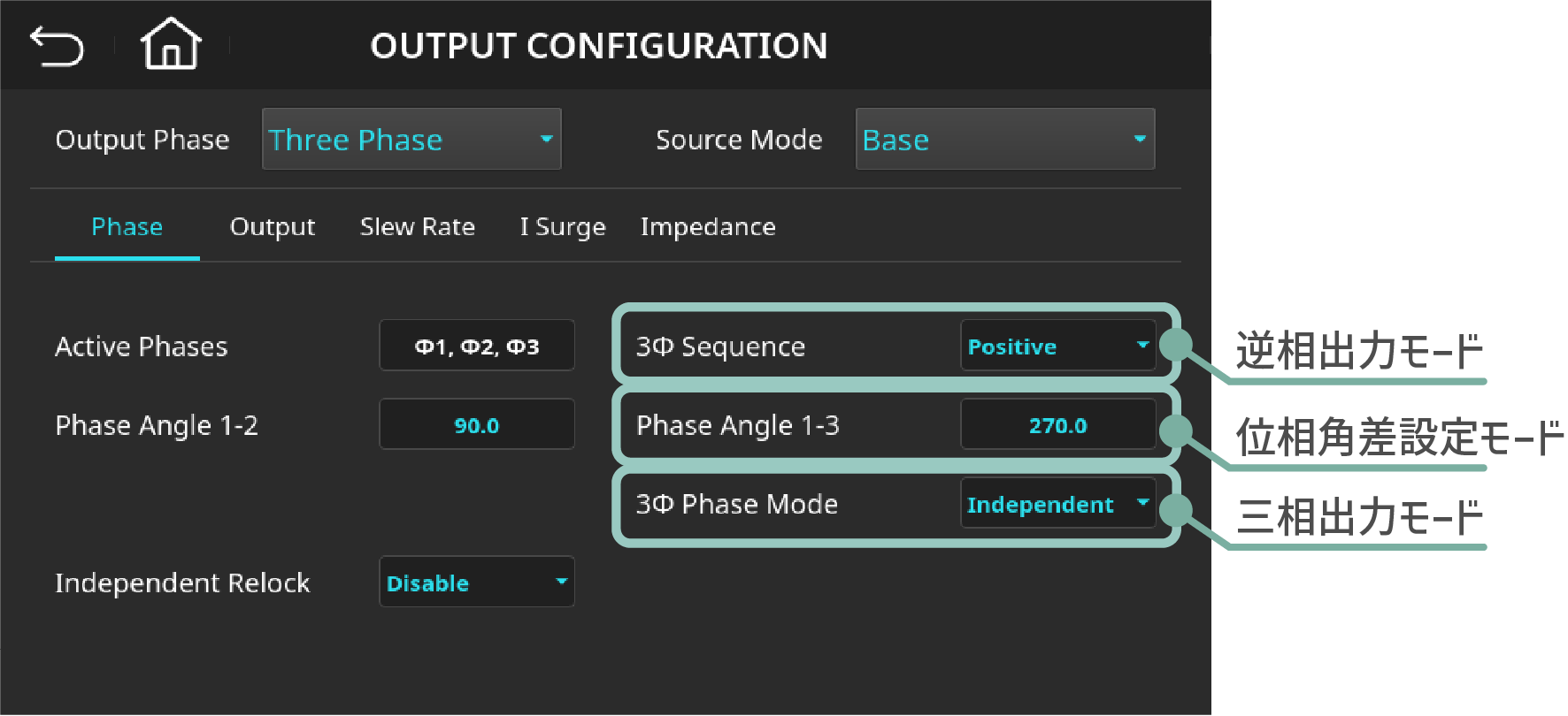 三相出力モードでは、3つ不平衡出力に対応しております。それぞれ設定することであらゆる不平衡出力に対応することが可能となりました。