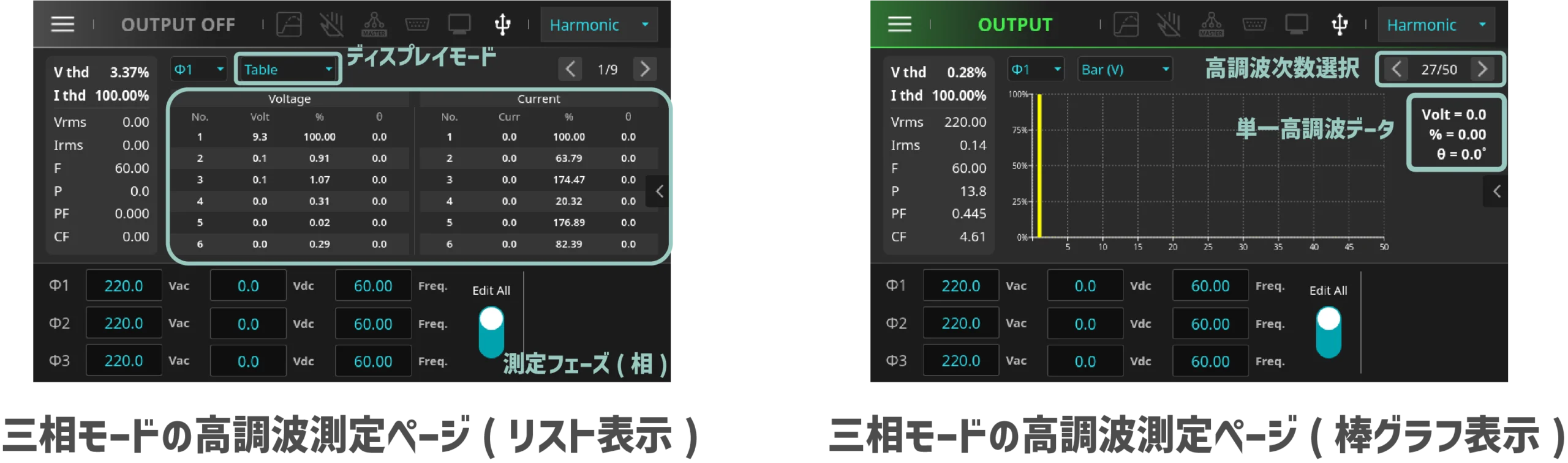 高調波測定機能は、基本周波数(F)に基づく出力電圧と電流の全高調波歪み(THD)に加え、1次から50次までの高調波データを測定できます。