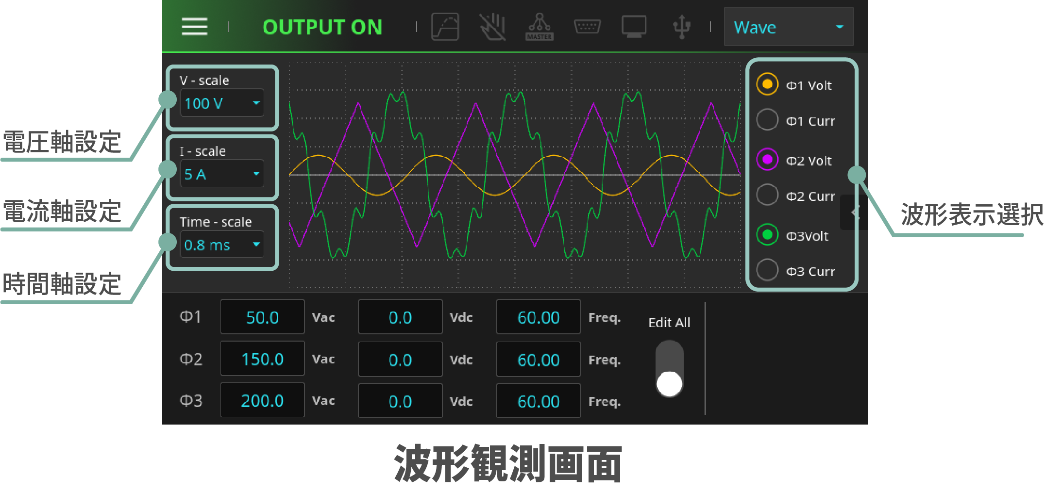 また波形表示は、垂直軸(V/Iスケール)、水平軸(時間スケール)の設定と表示する電圧チャネル(Φ1/Φ2/Φ3 Volt)と電流チャネル(Φ1/Φ2/Φ3 Curr)を選択可能で、必要な情報のみを表示することができます。