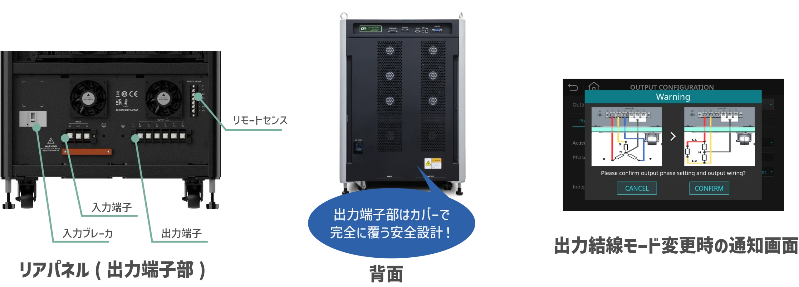 マルチ出力タイプ(三相/単相:DC/単相3線)に対応。結線変更であらゆる電源の模擬および負荷の評価・試験が可能です。