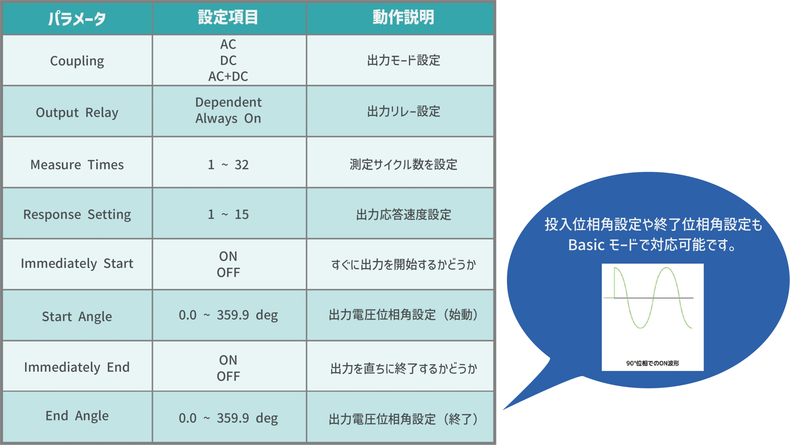 | Load ON / OFF 角度指定 | 負荷開始または停止時の角度について0~359°の間で指定可能 | |||