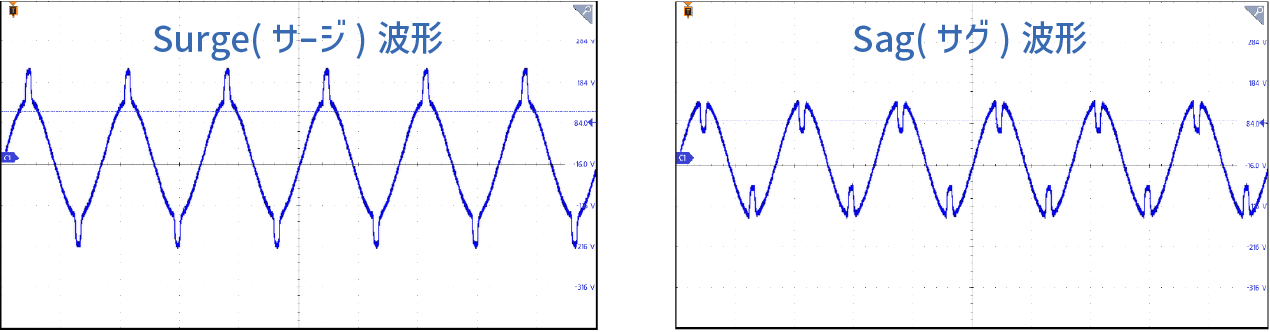 サージ(POP)とサグ(DIP)を発生させる出力シーケンスモードです。瞬停や瞬断試験や倍電圧試験などのイレギュラー電圧の再現が可能です。