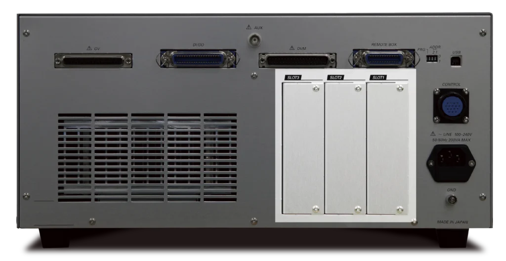 負荷・測定ユニットです。 5ch負荷、5chリップルノイズ測定、過電圧電源(8ch)、DVM(16ch)、Di/Do(各8ch)を内蔵しております。 増設用汎用スロットを使い、シーケンス測定(3ch)やCONTACT(C接点スイッチ:8ch)の増設が可能です。