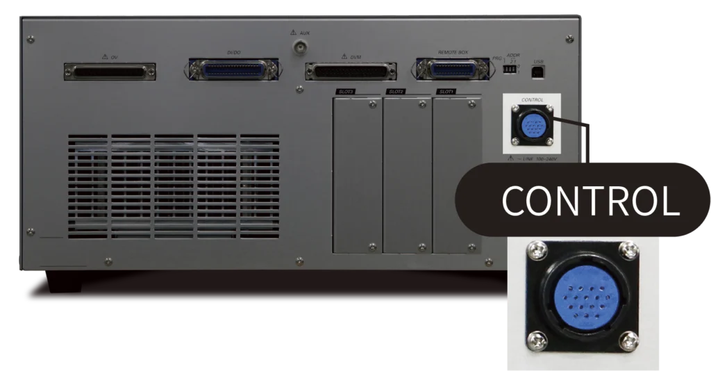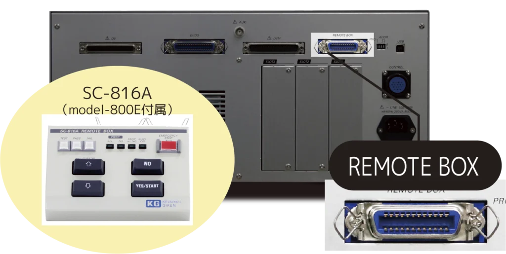 リモートBOX SC-816A制御用コネクタを装備*1。手元からの検査スタートからGO/NG信号の出力ができ、治具との組み合わせ可能です。