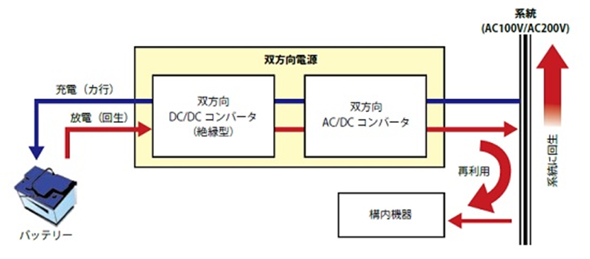 このような双方向電源を使うことによって、様々なケースで発生した回生電力を直流に変換してバッテリーに蓄電することができますので、回生電力の再利用をより効率的に行うことが可能となります。