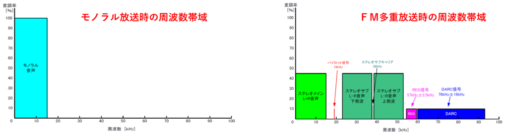 - 1つのFM搬送波(電波)で送信できる信号は基本的に1種類になっています。