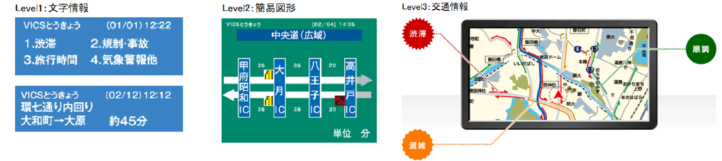 | VICS | Vehicle Information and Communication Systemの略 道路交通情報をカーナビゲーションに表示させるシステム全般を指します |