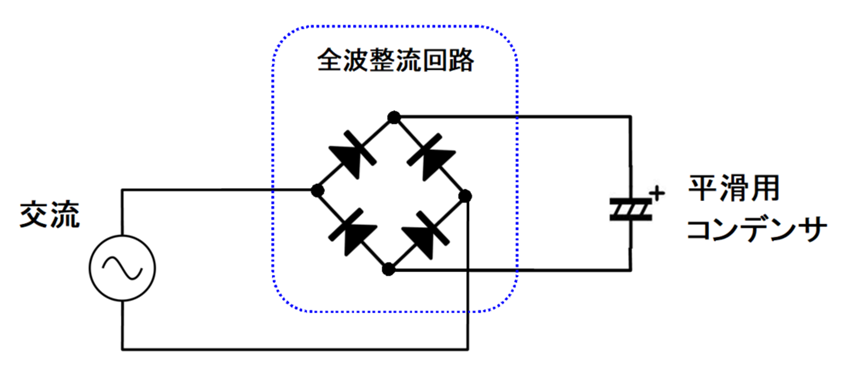 スイッチング電源で突入電流が発生する原因は、入力部のコンデンサに充電するための「充電電流」がその原因と言われています。スイッチング電源の入力部の回路は下図のように全波整流回路と平滑用コンデンサによって構成されています。電源OFFの状態では平滑用コンデンサは「空」の状態ですから、電源ONの直後にこの平滑用コンデンサを充電するため大きな充電電流が流れるという訳です。
