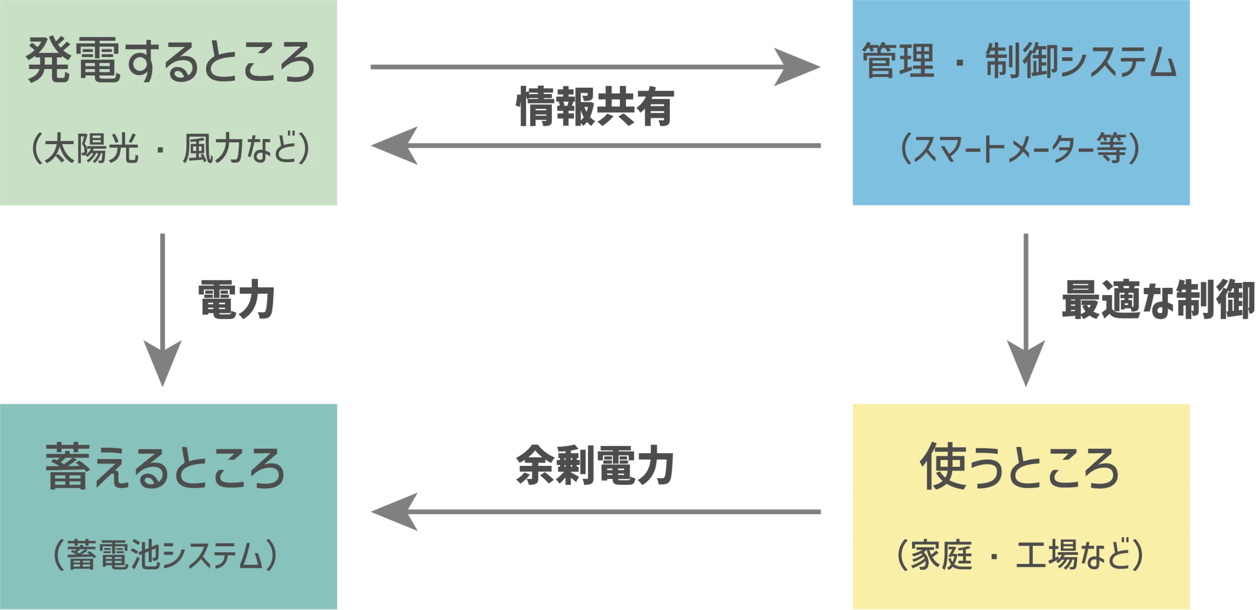 スマートグリッドは、電気の「つくる → おくる → ためる → つかう」を賢く管理する次世代の電力ネットワークです。